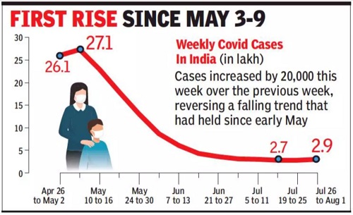India recorded just over 2.86 lakh new cases in the current week ended Sunday (July 26-August 1), a 7.5% rise from the previous week’s tally of 2.66 lakh. Weekly cases in the country have registered a rise for the first time since May 3-9, when the second wave peaked. The fall in cases had continued till last week, even though the decline had slowed to 1.4%.